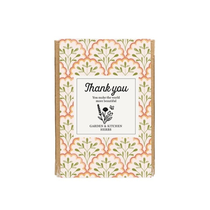 Každá kulička obsahuje semínka saturejky, koriandru, bazalky, tymiánu, šalvěje, dobromyslu, meduňky a rozmarýnu. Tato sada s nápisem Thank you bude krásným dárkem pro vaše blízké.