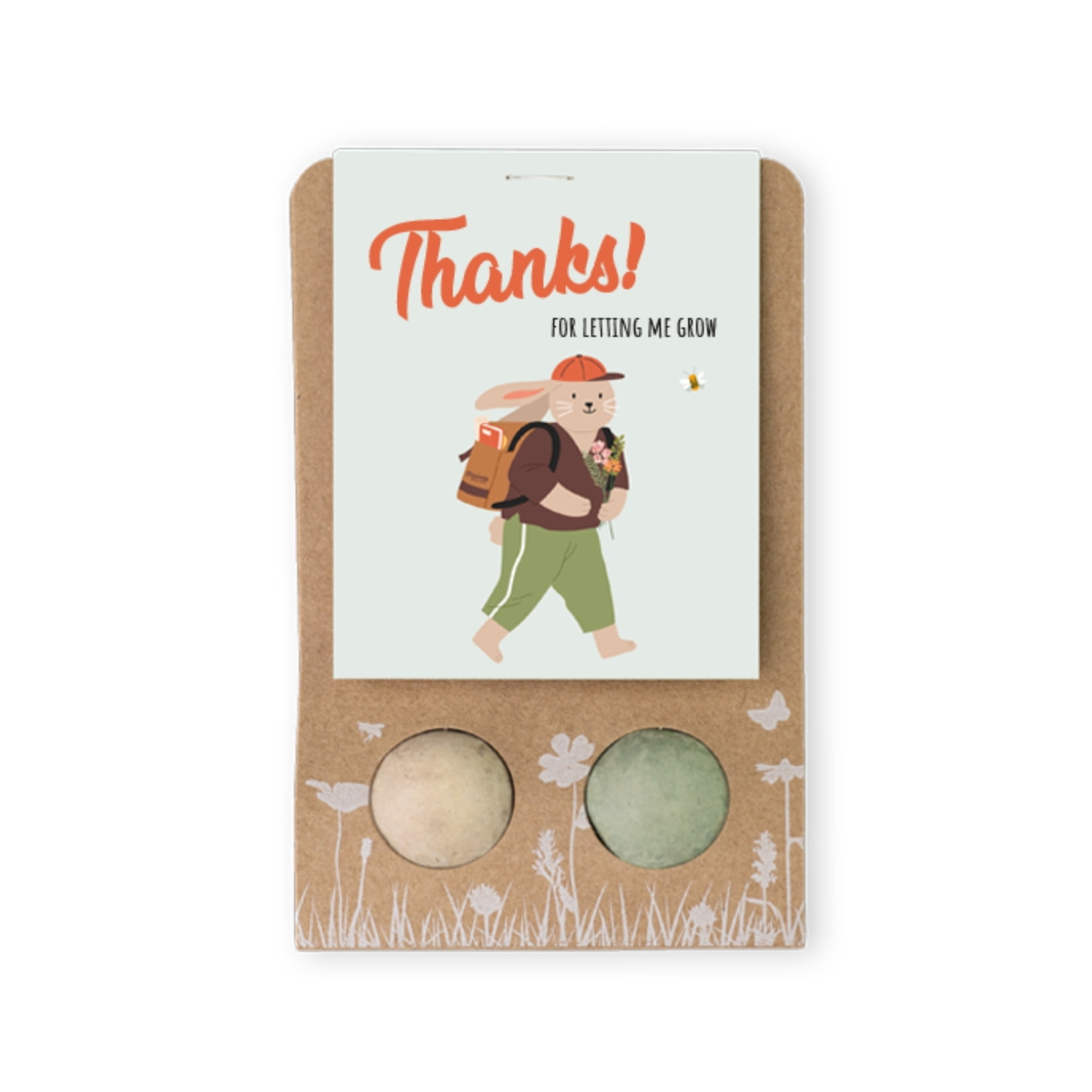 Ať už je důvod vyjádření vděku jakýkoli, nápis Thanks for letting me grow (děkuji, že mě necháváte růst) - to řekne za vás. Součástí jsou dvě barevné bomby ze 100% přírodních ingrediencí a organických semen volně rostoucích květin.