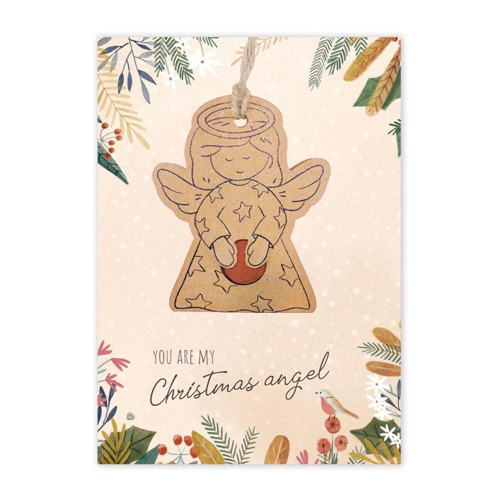 Závěsná dekorace ve tvaru andílka ukrývá barevnou kuličku ze 100% přírodních ingrediencí a organických semen volně rostoucích květin. Připevněna je na krásně ilustrované vánoční kartičce, kterou si můžete zarámovat nebo připnout na nástěnku nebo lednici.