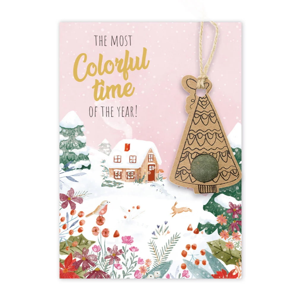 Závěsná dekorace ve tvaru stromečku ukrývá barevnou kuličku ze 100% přírodních ingrediencí a organických semen volně rostoucích květin. Připevněna je na krásně ilustrované vánoční kartičce, kterou si můžete zarámovat nebo připnout na nástěnku nebo lednici.