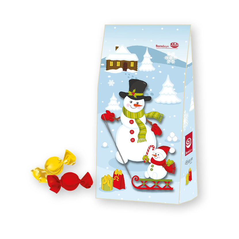 Čokoládové pralinky plněné mléčným krémem v krásném balení s motivem sněhuláka Složení: cukr, rostlinné tuky v různém poměru (kokosový, z palmových jader, palmový), kakaové máslo, sušené plnotučné MLÉKO (6,8%), kakaová hmota, sušená MLÉČNÁ SYROVÁTKA, sušené odstředěné MLÉKO (3,4%), emulgátor:SOJOVÝ lecitin, aromata. Obsah kakaové sušiny v mléčné čokoládě nejméně 29%, mléčné sušiny nejméně 14%. Může obsahovat jiné skořápkové plody a lepek. Skladování: v suchu, chraňte před teplem Hmotnost: 94,5g Rozměry: cca Výška 17,5 cm x šířka 9,5 cm x hloubka 5,5 cm