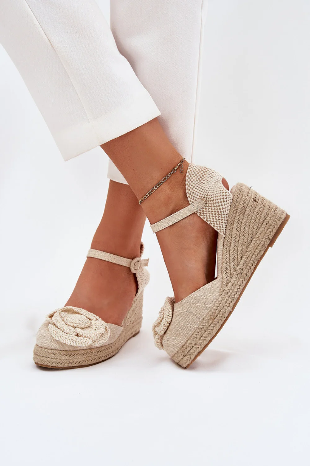 Dámské sandály vyrobené z textilního materiálu, osazené na klíně s pletenkou, jsou stylovou a pohodlnou volbou na letní dny. Zakryté špičky přidávají eleganci a háčkovaný květ vpředu přitahuje pozornost, dodávají jim zvláštní kouzlo. Zapínání na přezku s nastavitelným páskem zaručuje ideální přizpůsobení noze. Skvělé do letních outfitů, spojují pohodlí s trendy vzhledem. materiál plátno Stélka plátno Výška podpatku 8 cm Velikost Délka vložky 3623.5 cm3724 cm3824.5 cm3925.5 cm4026 cm4126.5 cm