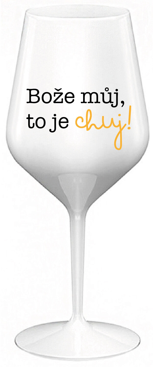 Nerozbitná bílá vinná sklenice s motivem BOŽE MŮJ, TO JE CHUJ je skvělá na zahradu, pláž, výlet, piknik a parádu udělá i při kempování. Jelikož je vyrobená z kvalitního polykarbonátu je de facto nerozbitná. Je to luxusní kousek, s nímž si víno můžete vychutnat prostě kdekoliv. Mají ergonomický tvar, který příjemně padne do ruky a protože je lehká, usnadňuje to její přenášení. Je snadno skladovatelná a lehce se čistí. Díky svému designu si s ní můžete vychutnat doopravdy kdekoliv bezproblémové pití výborného vína. Materiál PP. Vyrobené s láskou v ČR
