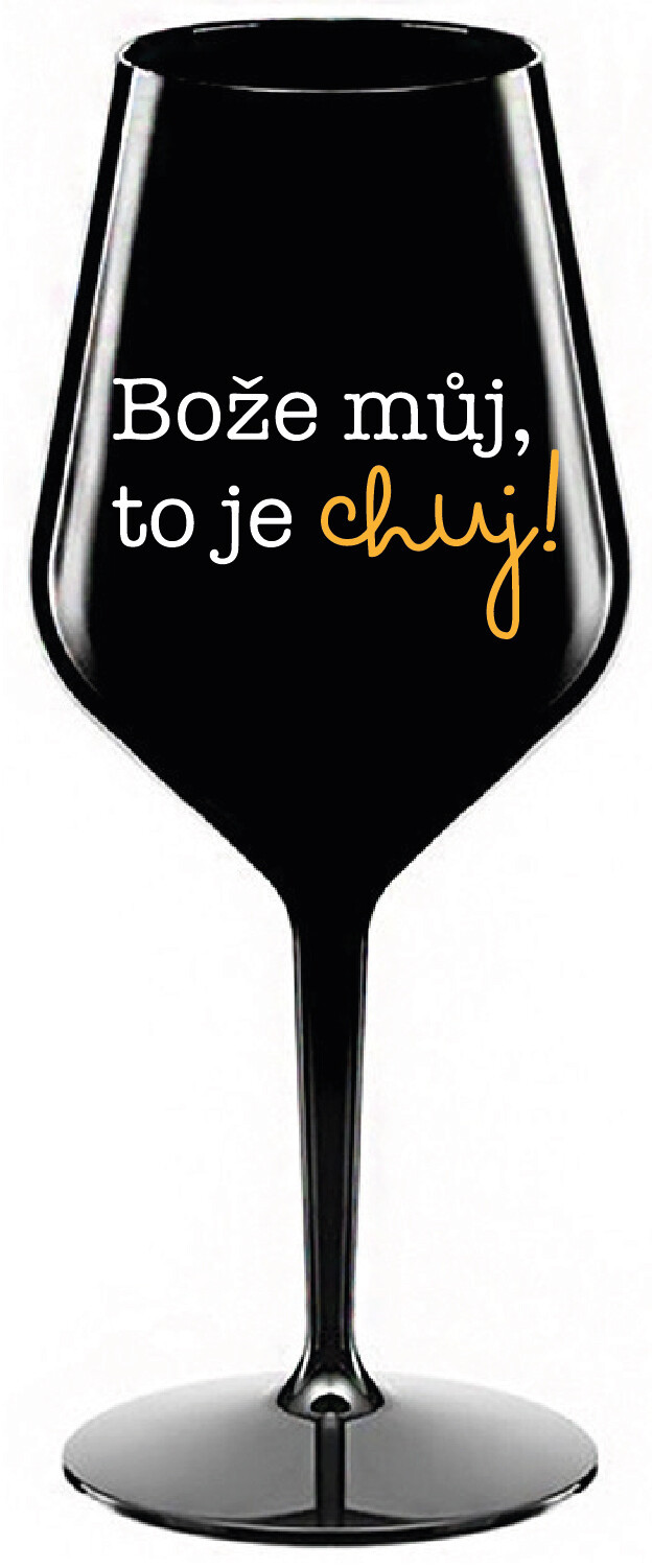 Nerozbitná černá vinná sklenice s motivem BOŽE MŮJ, TO JE CHUJ je skvělá na zahradu, pláž, výlet, piknik a parádu udělá i při kempování. Jelikož je vyrobená z kvalitního polykarbonátu je de facto nerozbitná. Je to luxusní kousek, s nímž si víno můžete vychutnat prostě kdekoliv. Mají ergonomický tvar, který příjemně padne do ruky a protože je lehká, usnadňuje to její přenášení. Je snadno skladovatelná a lehce se čistí. Díky svému designu si s ní můžete vychutnat doopravdy kdekoliv bezproblémové pití výborného vína. Materiál PP. Vyrobené s láskou v ČR