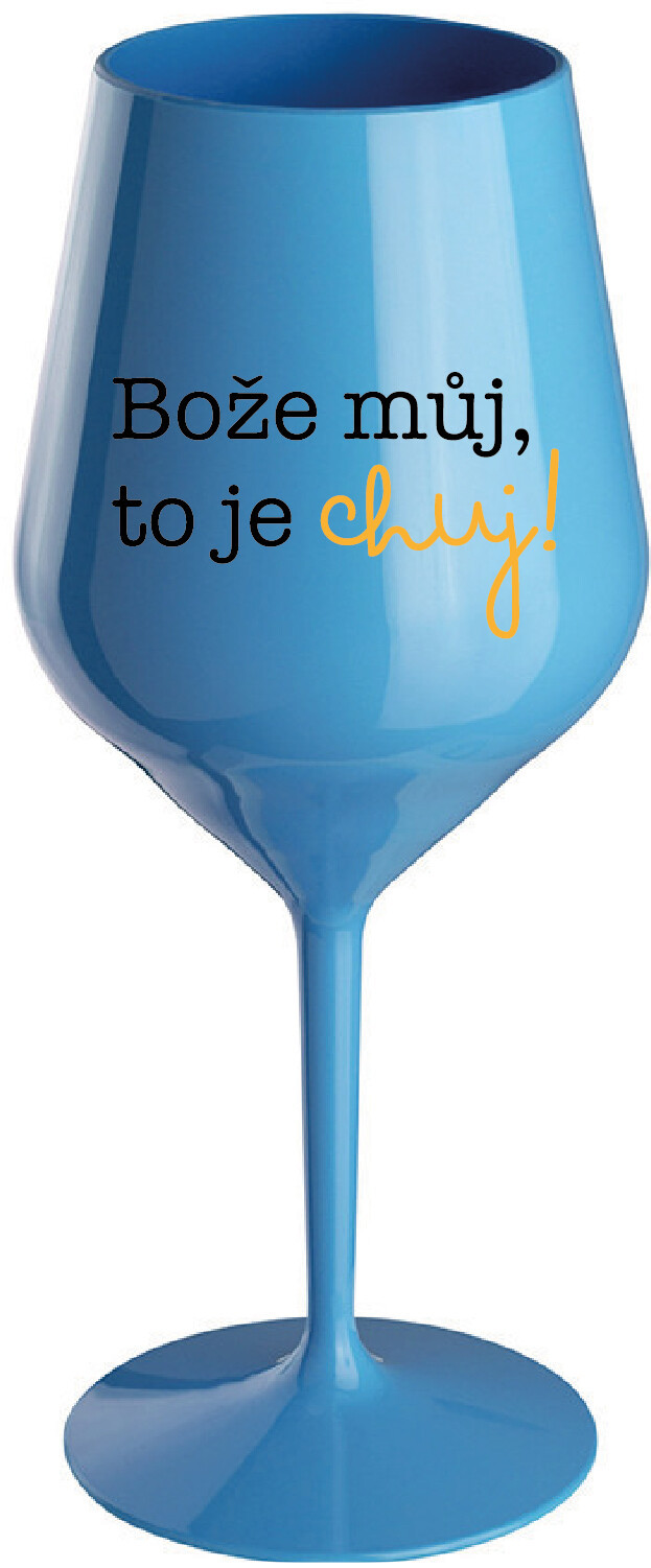 Nerozbitná modrá vinná sklenice s motivem BOŽE MŮJ, TO JE CHUJ je skvělá na zahradu, pláž, výlet, piknik a parádu udělá i při kempování. Jelikož je vyrobená z kvalitního polykarbonátu je de facto nerozbitná. Je to luxusní kousek, s nímž si víno můžete vychutnat prostě kdekoliv. Mají ergonomický tvar, který příjemně padne do ruky a protože je lehká, usnadňuje to její přenášení. Je snadno skladovatelná a lehce se čistí. Díky svému designu si s ní můžete vychutnat doopravdy kdekoliv bezproblémové pití výborného vína. Materiál PP. Vyrobené s láskou v ČR