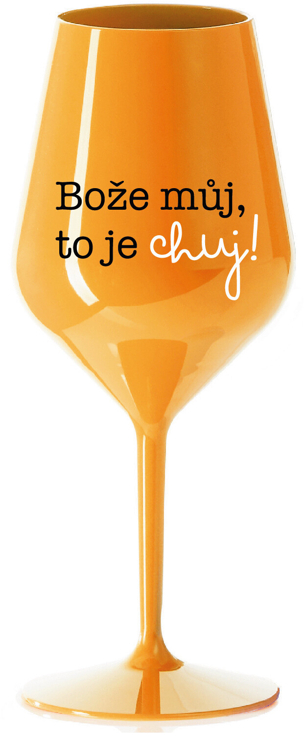 Nerozbitná oranžová vinná sklenice s motivem BOŽE MŮJ, TO JE CHUJ je skvělá na zahradu, pláž, výlet, piknik a parádu udělá i při kempování. Jelikož je vyrobená z kvalitního polykarbonátu je de facto nerozbitná. Je to luxusní kousek, s nímž si víno můžete vychutnat prostě kdekoliv. Mají ergonomický tvar, který příjemně padne do ruky a protože je lehká, usnadňuje to její přenášení. Je snadno skladovatelná a lehce se čistí. Díky svému designu si s ní můžete vychutnat doopravdy kdekoliv bezproblémové pití výborného vína. Materiál PP. Vyrobené s láskou v ČR
