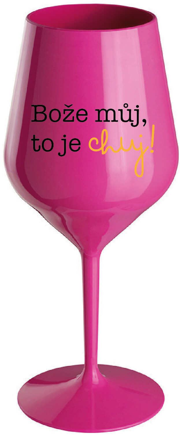 Nerozbitná růžová vinná sklenice s motivem BOŽE MŮJ, TO JE CHUJ je skvělá na zahradu, pláž, výlet, piknik a parádu udělá i při kempování. Jelikož je vyrobená z kvalitního polykarbonátu je de facto nerozbitná. Je to luxusní kousek, s nímž si víno můžete vychutnat prostě kdekoliv. Mají ergonomický tvar, který příjemně padne do ruky a protože je lehká, usnadňuje to její přenášení. Je snadno skladovatelná a lehce se čistí. Díky svému designu si s ní můžete vychutnat doopravdy kdekoliv bezproblémové pití výborného vína. Materiál PP. Vyrobené s láskou v ČR