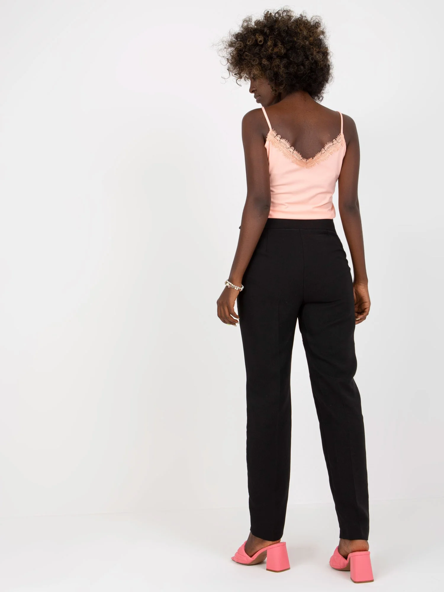 Oblekové kalhoty z černé látky s rovnými nohavicemi. doplňky: všitý pásek, boční kapsy Složení materiálu: 65 % polyester, 35 % viskóza. způsob praní: praní v pračce na 30 °C Kód produktu: BR-SP-113.59 dominantní vzor: hladký styl: elegantní příležitost: neformální, pracovní, městský, formální schůzka Modelka má na sobě velikost 36. Rozměry modelky: výška 168 cm, prsa 82 cm, pas 62 cm, boky 93 cm. Rozměry kalhot ve velikosti 36 měřené na plocho: šířka v pase - 38 cm, výška v pase - 30 cm, celková délka - 102 cm.Mezinárodní velikostVýškaObvod pasuObvod bokůVnější délka nohaviceDélka vnitřní nohavice34XS156-16466-7486847336S160-16872-8090877438M162-17278-8694907540L164-17484-90102947642XL166-17888-961069877442XL168-18092-10011010278