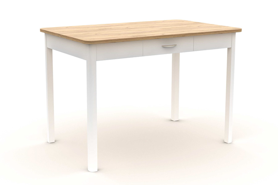 Jídelní stůl MILOŠ S02 je oproti vzhledově velmi podobnému jídelnímu stolu Jídelní stůl DANIEL S03 doplněn o praktický šuplík s kovovou úchytkou, do kterého si můžeme uschovávat věci, které na stolové desce nepotřebujeme nebo nechceme mít. Stůl je vhodný do malých místností kuchyňských koutů a obývacích pokojů. Díky možnosti volby barvy laminované desky se stůl hodí do světlých, ale i tmavých interiérů. Příznivá cena udává použití stolu také v restauracích, kavárnách a jídelnách, ale také na chatách a chalupách. Přejeme příjemné stolování. Typově stejný, rozměrově menší stůl se zásuvkou nabízíme pod názvem Patrik S01.
