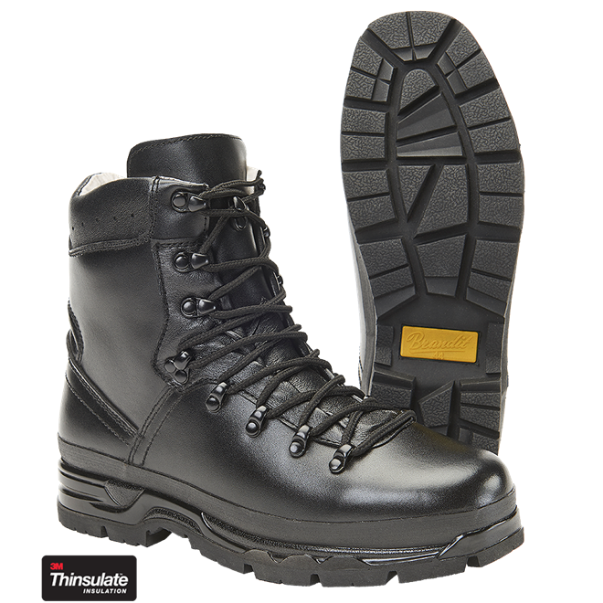 Horské boty německé armády Obuv vyrobená podle vzoru horských bot německé armády Bundeswehr. Boty jsou opatřeny speciálně tvarovanou podrážkou s protiskluzovým vzorkem. Obuv je zhotovena z kvalitní kůže a zateplena izolační vrstvou Thinsulate. Materiál: svrchní: 100 % kůže podšívka: 90 % polyester, 10 % bavlna Hmotnost: 1430 g / pár u velikosti 43 Výrobce: Brandit, Německo Kód výrobce: 9038
