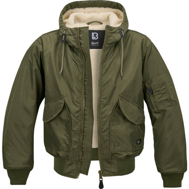 CWU (cold weather unit) bomber s kapucí a teplým kožíškem. Ideální bunda do chladného počasí. Jednoduchý nadčasový vzhled, pohodlné nošení a tepelný komfort. Příjemný hřejivý kožíšek a teplá kapuce. bomber do chladného počasí (CWU) zateplená kapuce se stahováním šňůrkami dvě kapsy po stranách, zapínání chlopní se suchým zipem utility pocket s kapsičkou na zip na levém rukávu zapínání na kovový zip podložený prošívanou légou, ochrana proti profouknutí jedna vnitřní náprsní kapsa zapínaná na zip náplety v pase a na zakončení rukávů pro tepelný komfort podšívka - huňatý kožíšek z umělé kožešiny Materiál: 100 % nylon, podšívka 100 % polyester, zateplení 100 % polyester Hmotnost: 1000 g (velikost L) Výrobce: Brandit, Německo Kód výrobce: 3188