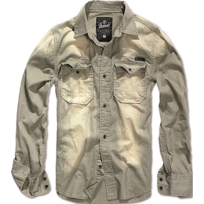 Bavlněná košile ve vintage stylu s efektem silného oprání Rovný, volný střih, prostorné rukávy. Na hrudi dvě symetrické kapsy zakryté klopami na knoflíky. Dolní okraje kapes a klopy mají výrazně zkosené rohy. Zapínání na knoflíky. Materiál: 100 % bavlna Hmotnost: 430 g (vel. L) Výrobce: Brandit, Německo