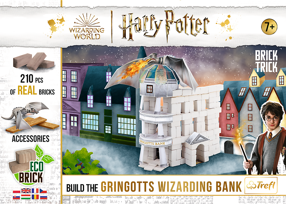 Postavte si věhlasnou Gringottovu banku z přírodních cihel a skutečného dřeva. Skládejte cihlu za cihlou, řežte a lepte prkénka, postupujte od základů až po dokončenou budovu a nakonec svůj výtvor ozdobte přiloženými dekoracemi. Výrobek můžete kombinovat s dalšími sadami ze série Brick Trick Harry Potter a vytvořit tak komplex staveb ze světa čar a kouzel včetně hradu Bradavicích. V zájmu ochrany životního prostředí firma Trefl zvýšila počet přírodních komponentů a snížila počet plastových prvků v sestavách. Všechny produkty ze série Brick Trick – Harry Potter obsahují více než 93% přírodních materiálů. Stavebnici lze používat opakovaně (lepidlo je rozpustitelné vodou). Rozměry stavby: 23 x 16 x 17 cm. Obsah balení: - 210 skutečných cihliček - dřevěná prkénka - dekorační doplňky - lepidlo - návod