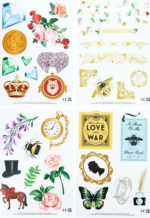 <p>Sada samolepek s licenčním motivem seriálu Bridgetonovi. Obsahuje 4 archy samolepek.</p>
