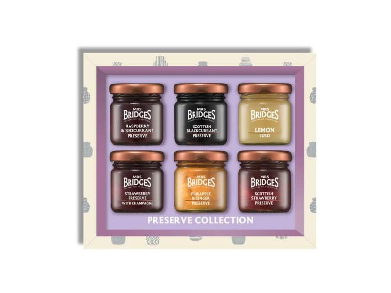 SADA DŽEMŮ A ZAVAŘENIN V DÁRKOVÉM BALENÍObsah sady: CITRÓNOVÝ KRÉMSložení: Cukr, celá VEJCE (pasterizovaná), máslo (MLÉKO), citrónová šťáva (z koncentrátu) (4%), modifikovaný kukuřičný škrob, želírovací látka: pektin, citrónový olej, regulátor kyselosti: kyselina citrónová.Alergeny jsou vyznačeny TUČNĚ.Výživové údaje ve 100g:Energetická hodnota 1518 kJ / 359 kcalTuk 5,7g (z toho nasycený tuk 3,3g)Sacharidy 75g (z toho cukr 69g)Bílkoviny 1,4gSůl 0,06gEXTRA DŽEM MALINY A ČERVENÝ RYBÍZSložení: Cukr, maliny (35%), červený rybíz (10%), želírovací látka: pektin, regulátor kyselosti: kyselina citrónová.Obsah ovoce 45g/100g. Obsah cukru 65g/100g.Výživové údaje ve 100g:Energetická hodnota 1104 kJ / 260 kcal)Tuk 0g (z toho nasycený tuk 0g)Sacharidy 63g (z toho cukry 63g)Bílkoviny 0gSůl 0,01g. JAHODOVÝ EXTRA DŽEMSložení: Cukr, jahody, želírovací látka: pektin, regulátor kyselosti: kyselina citrónová.Obsah ovoce: 45g na 100g. Obsah cukru: 65g na 100g.Výživové údaje ve 100g:Energetická hodnota 1120 kJ / 264 kcalTuk 0g (z toho nasycený tuk 0g)Sacharidy 64g (z toho cukry 64g)Bílkoviny 0gSůl 0,02g.EXTRA DŽEM ČERNÝ RYBÍZSložení: Cukr, černý rybíz, želírovací látka: pektin, regulátor kyselosti: kyselina citrónová.Obsah ovoce 35g/100g. Obsah cukru 65g/100g.Výživové údaje ve 100g:Energetická hodnota 1072 kJ / 252 kcalTuk 0g (z toho nasycený tuk 0g)Sacharidy 62g (z toho cukry 62g)Bílkoviny 0gSůl 0,01g.ANANASOVÝ EXTRA DŽEM SE ZÁZVOREMSložení: Cukr, ananas (43%), zázvor (2%), želírovací látka: pektin, regulátor kyselosti: kyselina citrónová.Obsah ovoce 45g/100g. Obsah cukru 65g/100g.Výživové údaje ve 100g:Energetická hodnota 1143 kJ / 269 kcalTuk 0g (z toho nasycený tuk 0g)Sacharidy 67g (z toho cukry 66g)Bílkoviny 0gSůl 0,02g.JAHODOVÝ EXTRA DŽEM SE ŠAMPAŇSKÝMSložení: cukr, jahody, šampaňské (0,7%), želírovací látka: pektin, víno Marc de Champagne (0,3%), regulátor kyselosti: kyselina citrónová.Obsah ovoce 45g/100g. Obsah cukru 65g/100g.Výživové údaje ve 100g:Energetická hodnota 1101 kJ / 259 kcalTuk 0g (z toho nasycený tuk 0g)Sacharidy 63g (z toho cukry 62g)Bílkoviny 0gSůl 0,02g.Obsah balení: 252g (6x42g). Vyrobeno ve Skotsku.