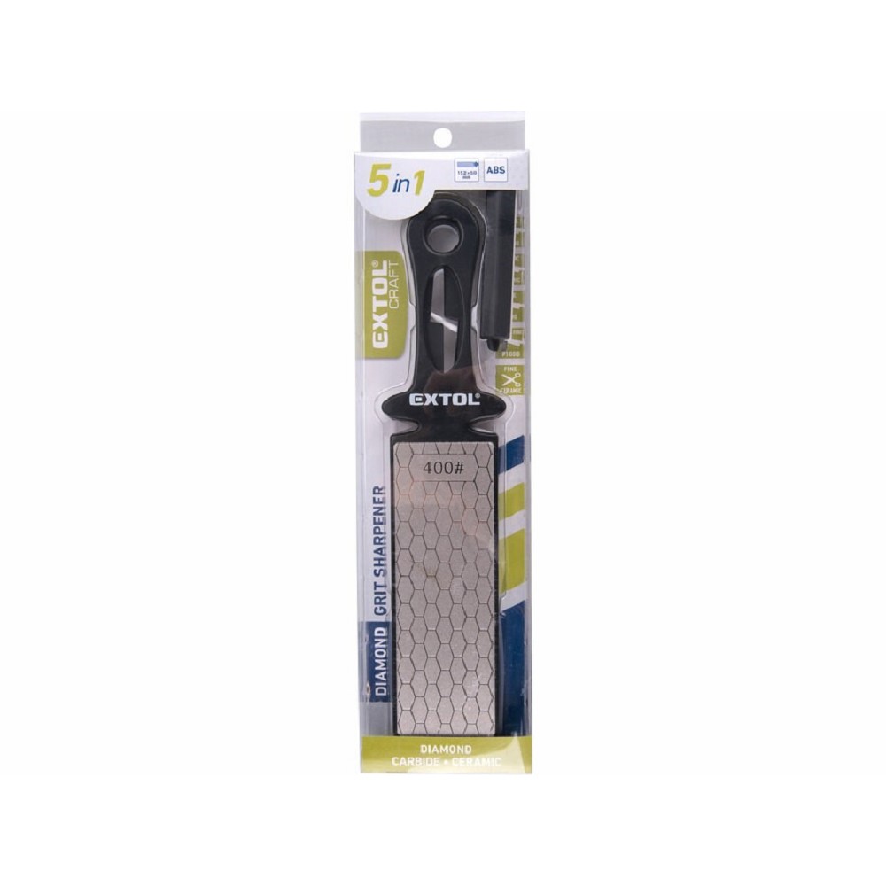 Brousek diamantový na nože a nůžky 5v1 P400/P1000 Extol Premium 954403 Představujeme vám špičkový nástroj, který se stane nepostradatelným pomocníkem ve vaší kuchyni či dílně. Díky své multifunkčnosti a preciznímu zpracování zajistí, že vaše nože a nůžky budou vždy dokonale ostré a připravené k použití. Proč si vybrat právě tento brousek? Oboustranný diamantový brousek: S hrubostmi P400 a P1000 umožňuje jak hrubé, tak jemné broušení. Hrubší strana (P400) je ideální pro opravu poškozených čepelí, zatímco jemnější strana (P1000) zajistí dokonalé naostření a hladký povrch ostří. Plastovo-keramický vodič: Tento inovativní prvek pomáhá udržet konstantní úhel čepele vůči brousku, což zajišťuje rovnoměrné a efektivní broušení bez rizika poškození nástroje. Dva sloty pro nože: V horní části rukojeti se nacházejí dva sloty – jeden s karbidovými plátky pro hrubé broušení a druhý s keramickými plátky pro finální naostření. Tato kombinace zaručuje rychlé a snadné obnovení ostří vašich nožů. Slot pro nůžky: Uvnitř rukojeti je umístěn speciální slot s keramickými plátky určený pro ostření nůžek. Díky tomu můžete snadno a bezpečně naostřit i nůžky, které často bývají opomíjeny. Použití brousku: Broušení nožů na oboustranném diamantovém brousku: Položte brousek na stabilní povrch.Zvolte vhodnou hrubost (P400 pro hrubé broušení, P1000 pro jemné broušení).Přiložte čepel nože k brousku pod úhlem přibližně 20° a táhněte ji po brousku směrem k sobě. Opakujte tento pohyb 5–10krát na každé straně čepele. Broušení nožů pomocí slotů v rukojeti: Pro hrubé broušení vložte čepel nože do slotu s karbidovými plátky a několikrát ji protáhněte směrem k sobě.Pro finální naostření použijte slot s keramickými plátky stejným způsobem. Ostření nůžek: Otevřete nůžky a vložte jednu čepel do slotu určeného pro nůžky.Několikrát protáhněte čepel směrem k sobě.Opakujte stejný postup pro druhou čepel. Technické parametry: Zrnitost: P400/P1000Materiál: Diamantový prach, karbid, keramika, ABS plastRozměry: 280 x 55 x 18 mmHmotnost: 0,28 kg