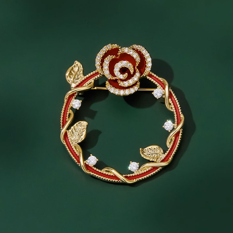 Brož ve tvaru kruhu s květem růže je symbolem elegance, romantiky a jemné ženskosti. Zlaté linie, červená smaltovaná výplň a precizně zasazené zirkony vytvářejí působivou kompozici, která připomíná věneček s květy růže a listy. Květinový motiv uprostřed brože je ozdobený třpytivými zirkony, které jí dodávají sofistikovaný nádech.Barevná kombinace červené a zlaté vyzařuje hřejivost, hloubku a vášeň. Každý detail je pečlivě zpracovaný tak, aby celek působil harmonicky a zároveň výrazně. Výrazná růže v horní části brože je ústředním prvkem, který zaujme na první pohled a dodá osobitost každému outfitu.Tato brož je ideální volbou pro slavnostní i výjimečné příležitosti. Skvěle se hodí na klopu kabátu, večerní šaty či elegantní sako a snadno doplní i minimalistický outfit o romantický šperk s charakterem. 💡Tip: Zkuste tuto brož připnout k hedvábnému šátku nebo na jemný šifónový top – zvýrazníte tak její květinový motiv a dodáte outfitu umělecký akcent.
