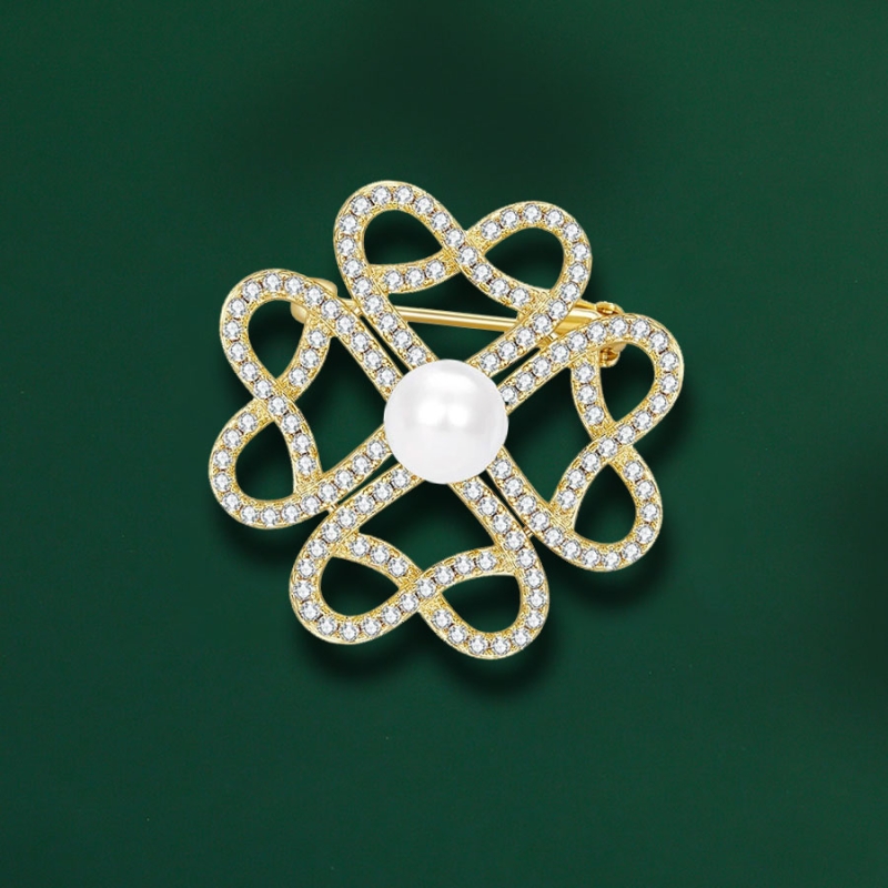 Tato elegantní brož ve tvaru čtyřlístku se srdíčky zaujme na první pohled svou jemnou symbolikou a precizním zpracováním. Dominantním prvkem je decentní perla umístěná uprostřed, která broži dodává šarm a nádech klasické elegance. Okvětní lístky v podobě srdcí jsou osázeny třpytivými zirkony, které krásně odrážejí světlo a přitahují pozornost.Brož představuje dokonalou volbu pro ženy, které hledají výrazný, ale přitom vkusný doplněk ke svému outfitu. Díky jemnému lesku zirkonů a lesklému povrchu se perfektně hodí jak k večerním šatům, tak k jednoduchému saku nebo halence, kterým dodá slavnostní nádech. Zlatavý odstín kovu podtrhuje luxusní vzhled celého šperku.Symbol čtyřlístku v sobě ukrývá přání štěstí, lásky a harmonie, zatímco tvar srdce odkazuje na cit a něhu. Tato brož je ideálním dárkem pro každou ženu, která si přeje nosit šperk s osobním významem a smyslem pro detail. 💡Tip: Darujte tuto brož jako symbol štěstí a lásky – potěší nejen svým elegantním vzhledem, ale i krásným poselstvím.