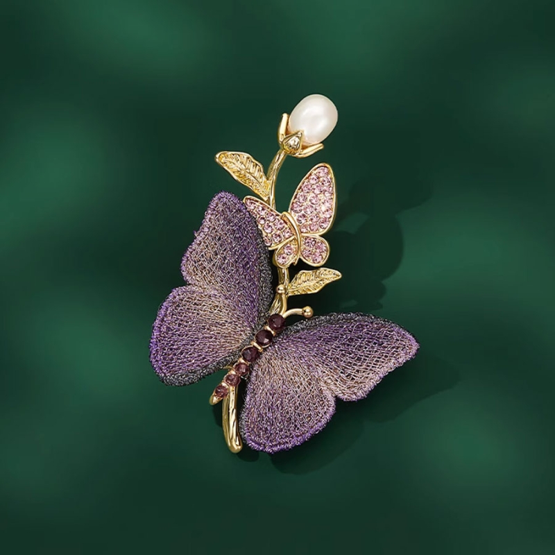 Elegantní brož s motivem dvou motýlů v sobě snoubí jemnost, hravost i noblesu. Dominantou šperku je větší motýl v metalickém fialovém tónu s hedvábným efektem křídel, který kontrastuje s menším motýlkem osazeným jemně růžovými kamínky. Celek korunuje detail perly, jež vyrůstá ze stylizované zlaté větvičky.Zlatý tón kovu v kombinaci s pastelovými barvami dodává broži jemně romantický vzhled, ale díky preciznímu zpracování zůstává šperk sofistikovaný a výrazný. Je ideální volbou pro ženy, které si potrpí na detaily a chtějí do outfitu vnést něco nevšedního.Tento šperk můžete nosit nejen na klopě saka, ale i na šatech, svetru nebo šálu. Brož zaujme na první pohled a dokáže proměnit i jednoduchý outfit v promyšlený styling s nádechem luxusu a originality. 💡Tip: Motýlí motiv je jako stvořený pro jaro a léto, kdy se příroda probouzí k životu. Tento šperk však díky perle a metalickým tónům využijete i v zimním období jako zajímavý kontrastní detail k pleteninám a kabátům.