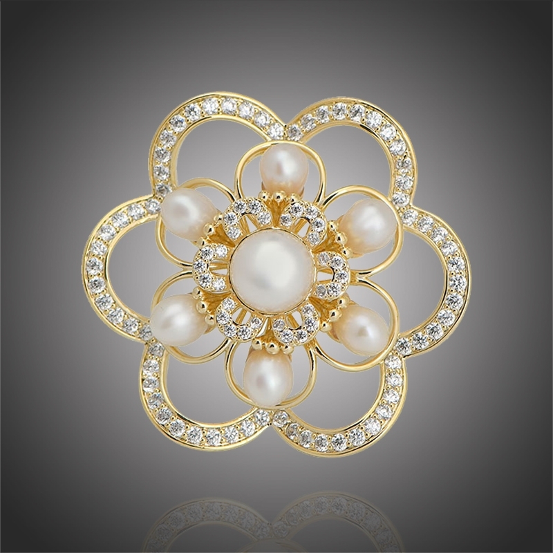 Nadšení v každé milovnici originálně zpracovaných šperků vzbudí tato překrásná perlová brož Thalia Gold ozdobena bílými sladkovodními perlami a čirými zirkony. Doplňte jí jakékoliv své oblečení a máte jistotu, že budete vypadat neodolatelně. Brož je do detailu propracovaná a firma Éternelle vdechla broži exkluzivitu, kterou podtrhávají detaily z 18karátového žlutého zlata.