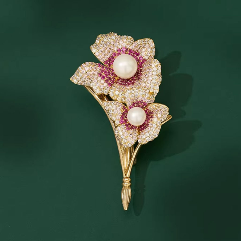 Tato výjimečná brož ve tvaru dvou rozkvetlých květů přináší do světa šperků zářivou souhru elegance a precizního řemesla. Základ tvoří bohatě zlacený kov s jemným žilkováním, který připomíná klasickou květinovou malbu v pohybu. Okvětní lístky jsou celé osazené drobnými třpytivými zirkony, přičemž střed každého květu korunuje jemná perla v krémově bílé barvě.Kombinace čirých a růžových kamínků vytváří okouzlující kontrast, který dává broži lehce vintage a zároveň mimořádně noblesní vzhled. Vizuální efekt je dokonalý – od prvního pohledu brož působí jako šperk z haute couture kolekce, který si zachovává jemnou ženskost i luxusní lesk.Ať už ji připnete na černé sako, elegantní šaty nebo kabát, okamžitě zvýrazní vaši sofistikovanost a vytříbený vkus. Je to výrazný, ale zároveň delikátní doplněk, který dokáže proměnit jednoduchý outfit v promyšlený celek. 💡 Tip: Tato brož je krásným dárkem pro ženu, která miluje květinové motivy a elegantní šperky – potěší k narozeninám, výročí i jako svatební dar.