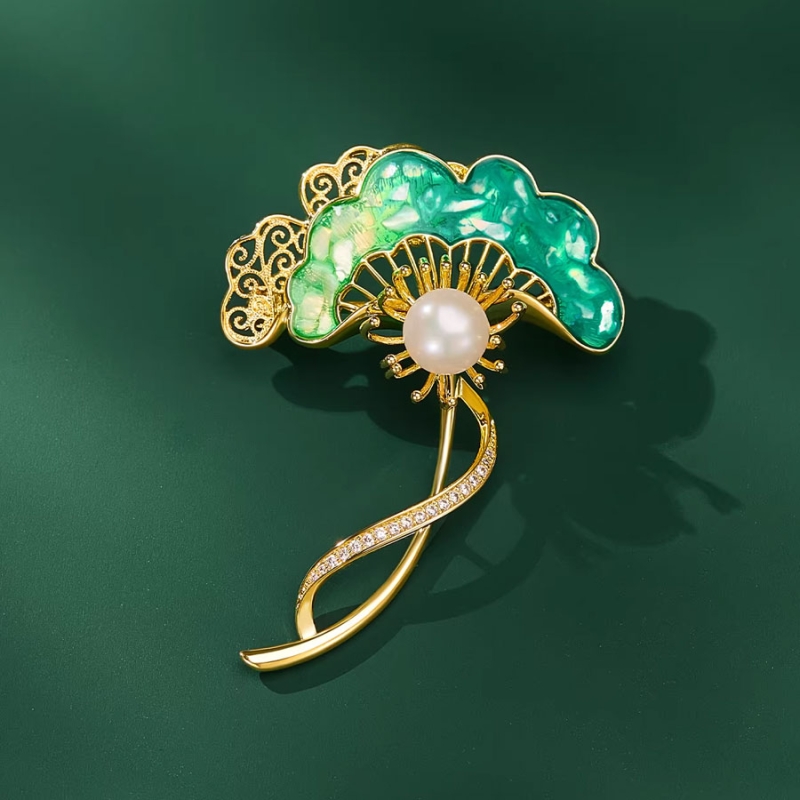Tato výjimečná brož ve tvaru listu jinanu dvoulaločného (Ginkgo biloba) představuje dokonalé spojení elegance a symboliky. Umělecky tvarovaný lístek z perleťově zeleného smaltu je orámován zlatavými liniemi a doplněn výraznou centrální perlou, kterou obklopuje zlatý vějíř s jemnými zirkony. Celek působí jako harmonické vyobrazení přírodní krásy a rafinovaného vkusu.List ginkga je od pradávna vnímán jako symbol dlouhověkosti, odolnosti a klidu – v kombinaci s perlovým středem vytváří duchovně laděný šperk, který osloví ženy hledající hloubku i noblesu. Brož vynikne na klopě saka, večerních šatech i jako ozdoba hedvábného šátku.Zlaté provedení a kontrast mezi jemnou perlou a zeleným odstínem vytváří poutavý vizuální efekt. Tento kousek není jen ozdobou – je vyjádřením osobního stylu, tichou výpovědí o rovnováze, kráse a ženské síle. 💡 Tip: Tvar ginkgového listu z ní dělá krásný talisman pro ženy, které si přejí najít v životě klid a stabilitu.