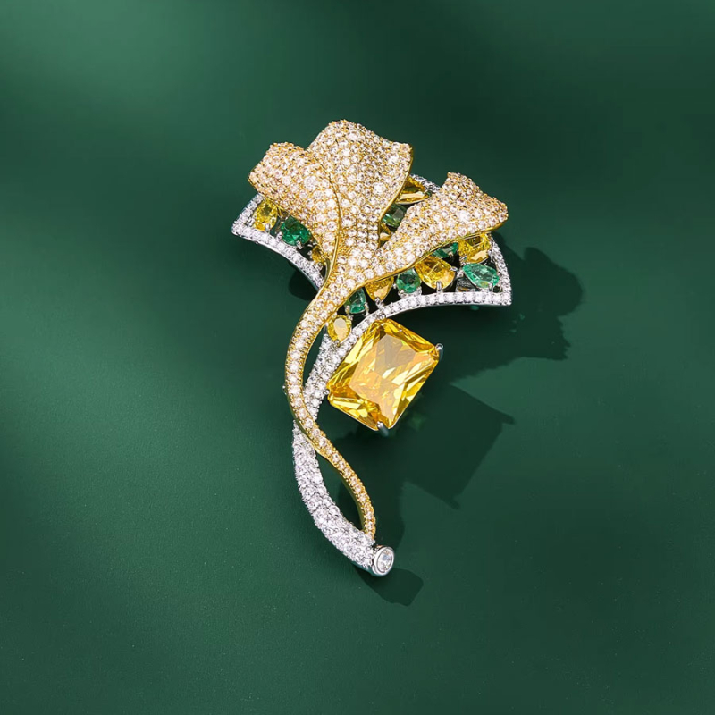 Tato výjimečná brož zaujme již na první pohled – bohatě třpytivý design je laděn do tónů zlata, jasu a slunečního světla. Dominantní žlutý krystal ve středu kompozice symbolizuje sílu a energii, zatímco jemně klenuté listy jinanu navazují na přírodní eleganci a nesmrtelnou krásu.Důmyslné osazení drobnými čirými i pastelově zelenými zirkony vytváří efekt lehkosti, luxusu a precizního šperkařského zpracování. Každý detail ladí v harmonii tvaru a lesku, čímž brož působí mimořádně noblesně – ideální jako šperk pro večerní róbu nebo slavnostní událost.Stylový motiv listu jinanu – stromu dlouhověkosti – činí z této brože nejen vizuálně poutavý doplněk, ale i nositelku hlubší symboliky. Hodí se pro ženy, které mají osobní sílu, odvahu růst a chuť zazářit v jakékoli situaci. 💡 Tip: Ideální šperk pro slavnostní události, jako jsou plesy, gala večery, svatby nebo vernisáže. Upoutá pozornost a dodá noblesu.