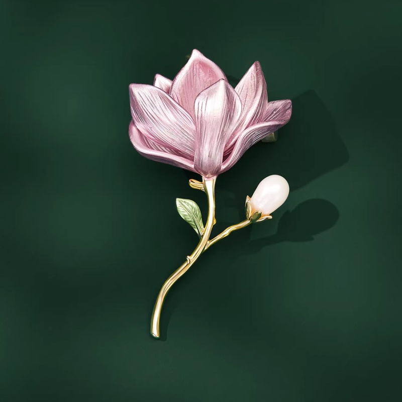 Okouzlující brož ve tvaru rozkvetlé magnólie přináší do vašeho outfitu jemnost, něhu a poetiku jarního rozkvětu. Smaltovaný květ v odstínech růžové a fialové je doplněn o realisticky ztvárněné zelené lístky, které umocňují přírodní ladění tohoto šperku.Uprostřed květu se vyjímá pravá sladkovodní perla, která dodává celé kompozici nádech luxusu a ženské elegance. Kontrast lesku perly a matného smaltu vytváří harmonický dojem a činí z brože skutečný šperk pro duši.Díky svému zpracování se brož hodí ke slavnostním šatům, ale i jako jemný akcent na sako, kabát či halenku. Je ideální volbou pro ženy, které milují přírodní motivy, umělecké detaily a smysl pro krásu v každém detailu. 💡 Tip: Tato brož je jako stvořená pro jaro – zkuste ji kombinovat s pastelovými šaty nebo lehkým šátkem při slavnostních příležitostech.