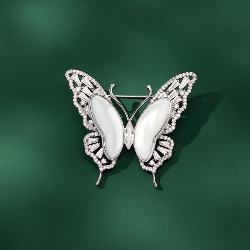 Elegantní brož ve tvaru motýla okouzlí svým jemným zpracováním a detailní kresbou křídel. Kombinace perleťových křídel s precizně zasazenými zirkony vytváří jedinečný šperk, který zaujme na první pohled.Střed brože zdobí podlouhlý zirkon ve tvaru marquise, který krásně ladí s celkovým designem a dodává motýlu lehkost i jiskru. Perleťové výplně křídel dodávají šperku jemný lesk a sofistikovaný vzhled.Tato brož je perfektní volbou pro výjimečné události i jako vkusný doplněk k večerním outfitům. Oživí sako, halenku nebo šaty a podtrhne vaši osobitost. 💡Tip: Brož ve tvaru motýla krásně vynikne na jednobarevném saku nebo kabátu, ale skvěle ozdobí také klopu šatů či šálu. Nebojte se ji použít i jako originální detail na kabelku.