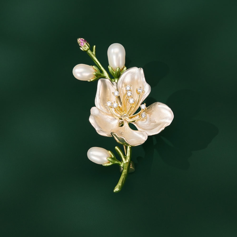 Tato okouzlující brož ve tvaru rozkvetlého květu je ztělesněním jemnosti, ženskosti a precizního zpracování. Zářivě perleťové okvětní lístky působí lehce jako hedvábí a jsou doplněny třpytivými čirými zirkony, které tvoří střed květu a připomínají kapky ranní rosy. Dekorativní větévky nesou drobné perly a poupata, díky nimž brož působí živě a plasticky.Barevné ladění brože v kombinaci perlově bílé, svěží zelené a zlatavého tónu vytváří harmonický celek, který vynikne jak na tmavém, tak světlém oblečení. Ručně malované detaily dodávají šperku autentický umělecký charakter, zatímco použití kvalitních materiálů zaručuje dlouhou životnost a příjemné nošení.Tato brož je perfektní volbou pro společenské události, divadelní večery i slavnostní příležitosti. Snadno se připíná k saku, halence nebo kabátu a stává se nepřehlédnutelným doplňkem, který podtrhne vaši osobnost a smysl pro detail. 💡 Tip: Připněte brož na jednoduchý pletený svetr nebo šálu během chladnějších dnů – i obyčejný outfit tak získá sofistikovaný nádech a stane se jedinečným. Květinový motiv brože nádherně kontrastuje s měkkými textiliemi a přitáhne pozornost jemným třpytem i elegantními liniemi.