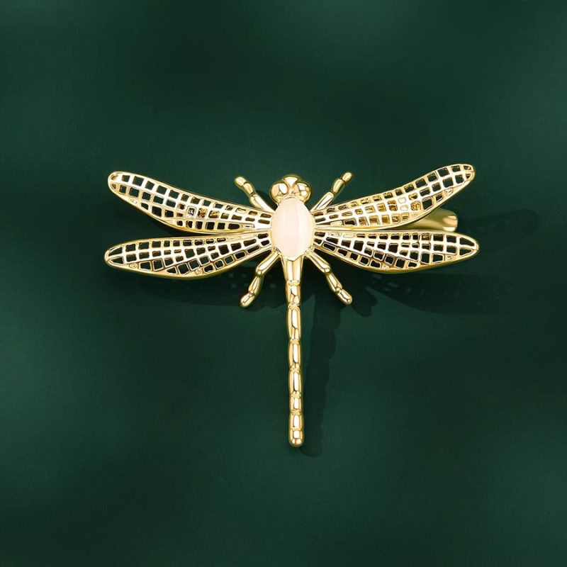 Tato elegantní brož ve tvaru vážky přináší jemnost přírody do světa luxusních šperků. Její silueta je ladná a lehká jako let vážky nad hladinou, zatímco zlatý kovový základ s precizně tvarovanými křídly působí vzdušně a moderně. Střed brože zdobí opál s jemnou mléčnou barvou, který dodává šperku éterický charakter a působí jako živoucí světlo uprostřed zlaté kompozice.Design této brože je založen na harmonii geometrie a organických tvarů. Křídla jsou vytvořena technikou jemné filigránové mřížky, která vyniká jak na tmavých, tak světlých látkách. Brož tak působí lehce, ale zároveň nepřehlédnutelně – jako výrazný módní akcent vhodný pro denní i večerní stylizace.Symbolika vážky je spojována s lehkostí bytí, změnou, přechodem mezi světy a duchovní silou. Opál pak do šperku vnáší nádech mystiky a nadčasové elegance. Tato brož je víc než pouhou ozdobou – je symbolem vnitřní svobody a ženské sebedůvěry. 💡 Tip: Vynikne zejména v jarních a letních měsících, kdy evokuje pohyb, svobodu a probouzející se přírodu – skvěle doplní květinové vzory nebo přírodní tóny.