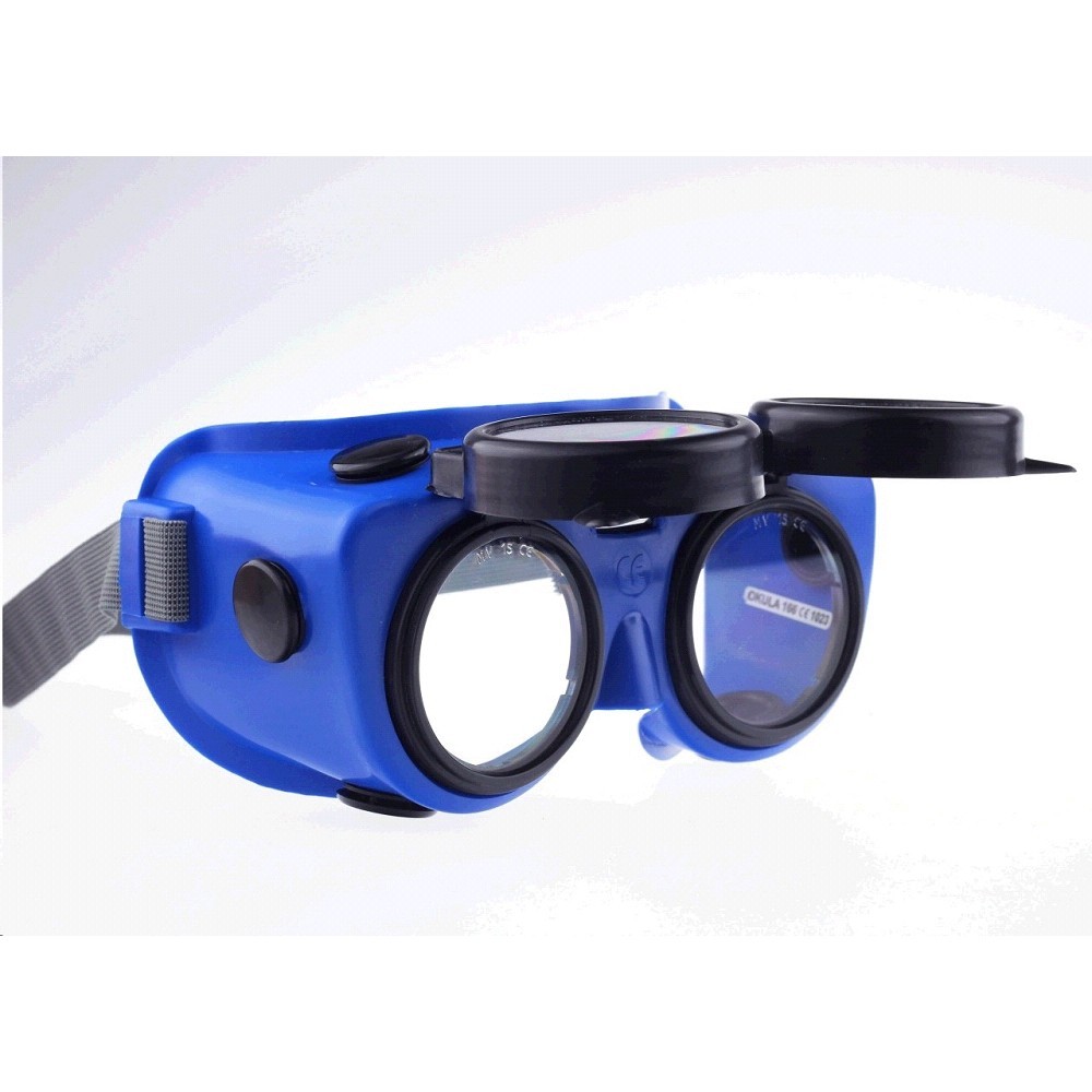 Brýle svářecí Okula B-V 24, sklopný rám - uzavřené ochranné brýle s očnicí s nepřímou ventilací a se sklopným rámem - očnice je osazena čirými zorníky z PC - sklopný rám je osazen svářečskými filtry SVAR se stupněm ochrany 4 až 8 a předsazenými čirými krycími zorníky z PC - při zvednutém rámu slouží tato brýle k ochraně očí před nárazem pomalu letících částic s dopadovou energií max. 0,56 J - při sklopeném rámu slouží k ochraně očí před zářením vznikajícím při pájení, svařování a řezání kovů plamenem - barevné provedení PVC očnice: světle modré, modré - možnost objednání náhradních zorníků
