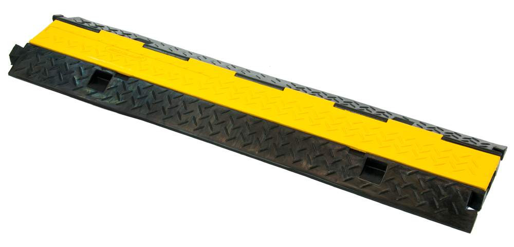 2-kanálová kabelová ochrana (přejezdová lišta), vhodná pro volná prostranství (interiér i exteriér), materiál: vyztužená pryž, rozměry: 1000 x 250 x 45 mm, rozměr 1 kanálu: 30 x 27 mm, hmotnost: 7 kg, dovolená zátěž: 3000 kg