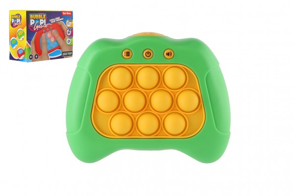Herní konzole má tvar gamepadu a je vybavena bublinami, které lze mačkat, a představuje tak zábavnou alternativu k tradičním videohrám. Cílem hry Bubble pops je co nejrychleji stisknout svítící tlačítka, aby světlo zhaslo. Herní módy: Začatečník mód : prozkoumejte režim a seznamte se s hrou Paměťový mód : Otestujte svou paměť zapamatovaním kombinací Skóre mód : Dosáhněte nejvyššího skóre Multiplayer mód : Vyzvěte své přátelé, rodinu a zjistěte kdo bude vítězem Hra je se světlem a zvukem, na baterie 3x AAA, které nejsou součástí výrobku. Rozměr krabičky: 13 x 10,5 cm Vhodné od 5 let