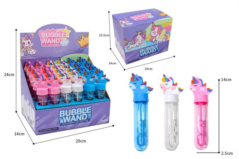 Bublifuk jednorožec. Velikost 14 cm. Přesné rozměry lahvičky 2,5x2,5x14 cm. Display box - 24 ks. 3 varianty - modrá, bílá, růžová.