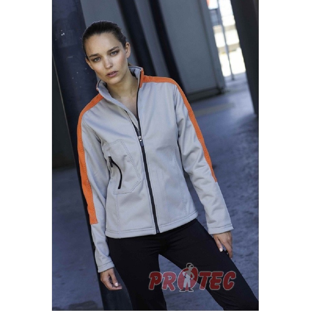 Bunda dámská SOFTSHELL KS307 Kariban Materiálové složení: 100% polyester Dámská sportovní bunda, celopropínací, nepromokavá, vodě odolná, kontrastní pruhy na ramenou, raglánové rukávy, kapsy na zip velikost S- XL barva šedá/oranžová