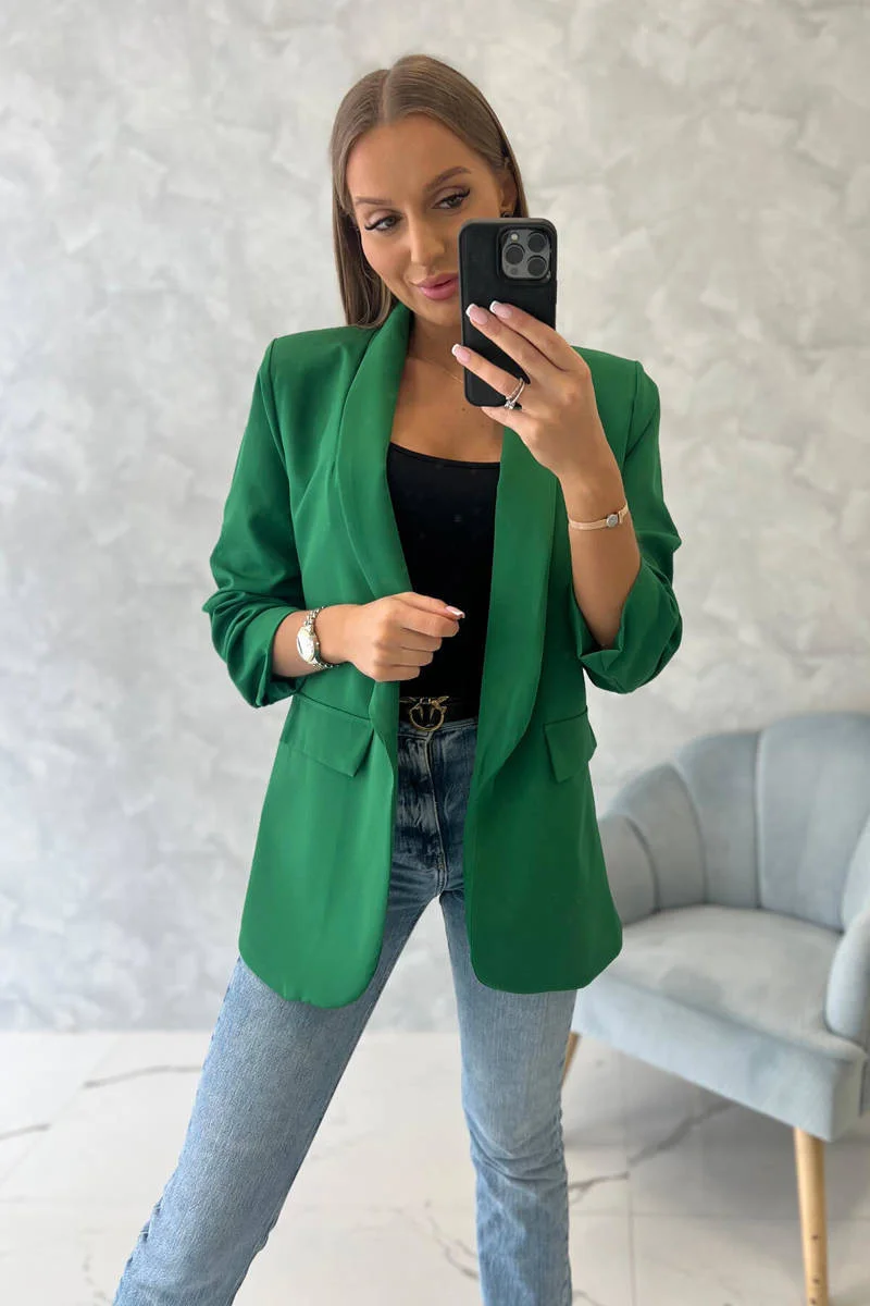 Představujeme vám elegantní sako. Sako bez zapínání s klopami vpředu. Tento model bude skvělou volbou pro mnoho typů postav, dodávající každému outfitu nenucenou eleganci. Je to základ každého šatníku a prvek stylizace pro speciální příležitosti - na každé roční období a na každou příležitost. Sako je vyrobeno z vysoce kvalitního materiálu. Sako má podšívku. Velikost je univerzální a bude vhodná pro dámy ve velikosti S, M a L. VÝROBA ITALSKÁ Složení materiálu: 100% Polyester Rozměry: Šířka pod pažemi: 50 cm Délka rukávu od ramene: 49 cm Délka rukávu od podpaží: 29 cm Celková délka: 71 cm