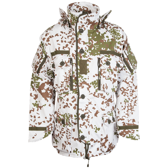 SMOCK II - bunda speciálních jednotek Bunda je vyvzorována podle potřeb speciálních jednotek Zapínání vpředu je řešeno dvoucestným zdrhovadlem překrytým légou zapínanou na štěrbinové knoflíky V pravé přední části bundy (vedle hlavního zdrhovadla) je průhmatový otvor zavíraný zdrhovadlem. Umožňuje přístup k vnitřním výstrojním součástkám bez nutnosti rozepnutí bundy Na předním díle jsou 2 náprsní a 2 přední vakové kapsy. Kapsy jsou překryté chlopněmi se štěrbinovými knoflíky. Pod kapsamy jsou skryty další vnitřní kapsy, které se otevírají zdrhovadly Další dvě vakové kapsy jsou na bocích bundy, opět jsou překryté chlopněmi se štěrbinovými knoflíky. Obě boční kapsy je také možno rozepnout zdrhovadly našitými na bocích kapes Jedna velká (23 x 37 cm) vaková kapsa je ve spodní části zadního dílu bundy. Kapsu je možné rozepnout třemi různými zdrhovadly. Dvěma bočními a jedním vrchním zdrhovadlem, které je překryto chlopní spínanou stuhovým uzávěrem Všechny vnější vakové kapsy jsou opatřeny průduchy pro možnost odvedení vody, která by se dovnitř dostala např. při brodění nebo za deště Na obou rukávech jsou našity dvojité kapsy s chlopněmi zavíranými stuhovými uzávěry. Kapsy i s chlopní jsou opatřené z vrchní části plošnými stuhovým uzávěry V loketní části rukávu se nachází kapsa s vyjímatelným chráničem Manžeta rukávu je vybavena páskem se stuhovým uzávěrem pro možnost stažení Bunda je opatřena odnímatelnou kapucí. Vnitřní podšívka kapuce je ze 100 % nylonu. Obličejovou část kapuce je možné upravit pomocí tkanice provlečené v lemu a opatřené na obou stranách samosvorkami. Na přední části kapuce je našit široký kšilt v jehož okraji je všit ohebný drát, kterým lze kapuci podle potřeby tvarovat. Na zadním díle kapuce se nachází pásek se stuhovým uzávěrem, kterým je možné regulovat hloubku kapuce Pro lepší odvětrání je bunda opatřena průchody v podpaží, jejichž rozevření lze regulovat zdrhovadly. Obvod dolního okraje bundy je možné upravit na obou stranách stažením provlečené tkanice zajištěné v žádané poloze samosvorkami Bunda není zateplená, je určena jako svrchní vrstva. Pro chladnější období je vhodné ji kombinovat s dalšími vrstvami oděvu. Materiál: 50 % polyester, 50 % bavlna RipStop (osnova materiálu zpevňuje látku a brání šíření případné trhliny) Hmotnost: 1885 g (vel. L) K této bundě lze zakoupit kalhoty ve shodném provedení: Kalhoty TACGEAR zásahové