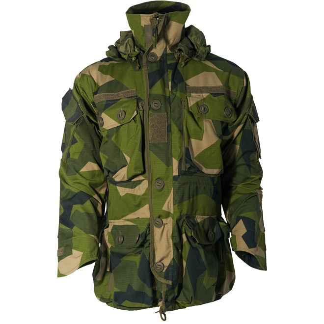 SMOCK II - bunda speciálních jednotek Bunda je vyvzorována podle potřeb speciálních jednotek Zapínání vpředu je řešeno dvoucestným zdrhovadlem překrytým légou zapínanou na štěrbinové knoflíky V pravé přední části bundy (vedle hlavního zdrhovadla) je průhmatový otvor zavíraný zdrhovadlem. Umožňuje přístup k vnitřním výstrojním součástkám bez nutnosti rozepnutí bundy Na předním díle jsou 2 náprsní a 2 přední vakové kapsy. Kapsy jsou překryté chlopněmi se štěrbinovými knoflíky. Pod kapsamy jsou skryty další vnitřní kapsy, které se otevírají zdrhovadly Další dvě vakové kapsy jsou na bocích bundy, opět jsou překryté chlopněmi se štěrbinovými knoflíky. Obě boční kapsy je také možno rozepnout zdrhovadly našitými na bocích kapes Jedna velká (23 x 37 cm) vaková kapsa je ve spodní části zadního dílu bundy. Kapsu je možné rozepnout třemi různými zdrhovadly. Dvěma bočními a jedním vrchním zdrhovadlem, které je překryto chlopní spínanou stuhovým uzávěrem Všechny vnější vakové kapsy jsou opatřeny průduchy pro možnost odvedení vody, která by se dovnitř dostala např. při brodění nebo za deště Na obou rukávech jsou našity dvojité kapsy s chlopněmi zavíranými stuhovými uzávěry. Kapsy i s chlopní jsou opatřené z vrchní části plošnými stuhovým uzávěry V loketní části rukávu se nachází kapsa s vyjímatelným chráničem Manžeta rukávu je vybavena páskem se stuhovým uzávěrem pro možnost stažení Bunda je opatřena odnímatelnou kapucí. Vnitřní podšívka kapuce je ze 100 % nylonu. Obličejovou část kapuce je možné upravit pomocí tkanice provlečené v lemu a opatřené na obou stranách samosvorkami. Na přední části kapuce je našit široký kšilt v jehož okraji je všit ohebný drát, kterým lze kapuci podle potřeby tvarovat. Na zadním díle kapuce se nachází pásek se stuhovým uzávěrem, kterým je možné regulovat hloubku kapuce Pro lepší odvětrání je bunda opatřena průchody v podpaží, jejichž rozevření lze regulovat zdrhovadly. Obvod dolního okraje bundy je možné upravit na obou stranách stažením provlečené tkanice zajištěné v žádané poloze samosvorkami Bunda není zateplená, je určena jako svrchní vrstva. Pro chladnější období je vhodné ji kombinovat s dalšími vrstvami oděvu. Materiál: 50 % polyester, 50 % bavlna RipStop (osnova materiálu zpevňuje látku a brání šíření případné trhliny) Hmotnost: 1885 g (vel. L) K této bundě lze zakoupit kalhoty ve shodném provedení: Kalhoty TACGEAR zásahové