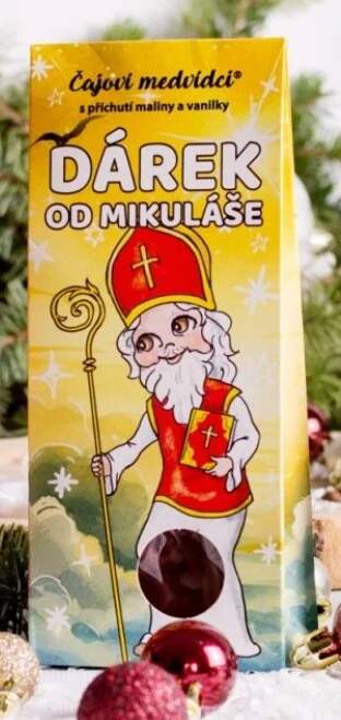 Víte jaká kombinace příchutí chutná dětem nejvíce? Malina s vanilkou! Mikulášská edice Obzvlášť když se podává ve formě medvídků. Medvídky zaléváte horkou vodou. Už na to děti nalákáte. A když přidáte ještě nějaký příběh, budou pít vaše děti s velkou chutí. Navíc příchuť je opravdu nejoblíbenější, vytváří příjemnou chuť, která bude chutnat i rodičům. Zkuste to! Ukažte dětem kouzelný nápoj – čajové medvídky. Vezmete 1 až 3 barevné medvídky, dáte je do hrnečku, zalijete horkou vodou, zamícháte lžičkou … a nápoj s čajovými medvídky je na světě. Děti se po něm mohou utlouct =) Složení: glukózový sirup, voda, želatina, cukr, bíla hroznová šťáva koncentrát, extrakt z bílého čaje 1%, rostlinné extrakty: bez, aroma, vosk, ovocný koncentrát: koncentrát jablečné šťávy, meruňková šťáva koncentrát, hrušková šťáva koncentrát. Nutriční hodnota na 100 g: Energetická hodnota 1500kJ / 352 kcal, Tuky, včetně: - <0,5g, z toho nasycené mastné kyseliny 0,2 g., Sacharidy, včetně: 82 g, z toho cukry 73 g, Protein 5g, Sůl 0,07g Hmotnost: 50 g