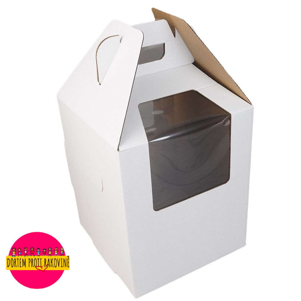 Bílá dortová krabice s úchytem. Krabice je z vnitřní strany hnědá. V balení je 10ks! Rozměr: 30,5 x 30,5 x 35,5 cm Při zakoupení tohoto produktu přispíváte 2Kč na skvělý projekt ,,Dortem proti rakovině". Jedná se o projekt na podporu onkologicky nemocných dětí a jsme moc rádi,že můžeme být součástí. Děkujeme Vám.
