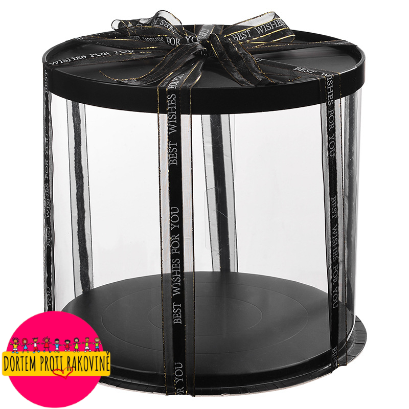 Elegantní průhledný box na dorty s černým podnosem a víkem. Box je opakovaně použitelný, což vám umožní předvést své dorty při každé příležitosti. Doporučujeme pod dort použít ještě tenkou podložku, aby se zabránilo poškození spodku boxu. Box je možné použít i na jiné dárkové předměty Stuha není součástí balení! Doporučujeme stuhu o šířce 25 mm Rozměry: 26x31cm Při zakoupení tohoto produktu přispíváte 2Kč na skvělý projekt ,,Dortem proti rakovině". Jedná se o projekt na podporu onkologicky nemocných dětí a jsme moc rádi,že můžeme být součástí. Děkujeme Vám.
