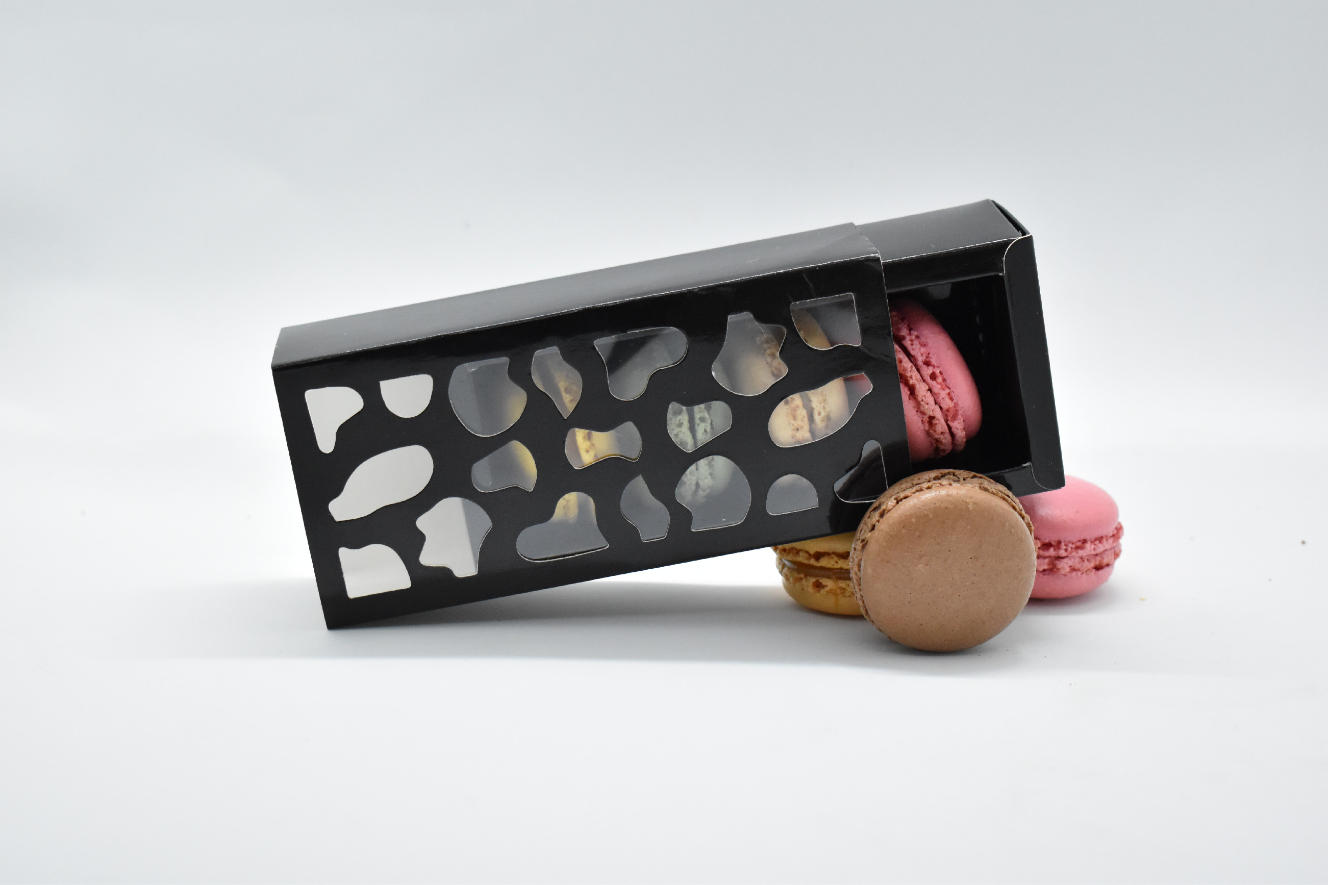 Cake star Krabička na makronky černá se vzorovým okénkem 13x6x4cm (na 4 kusy)