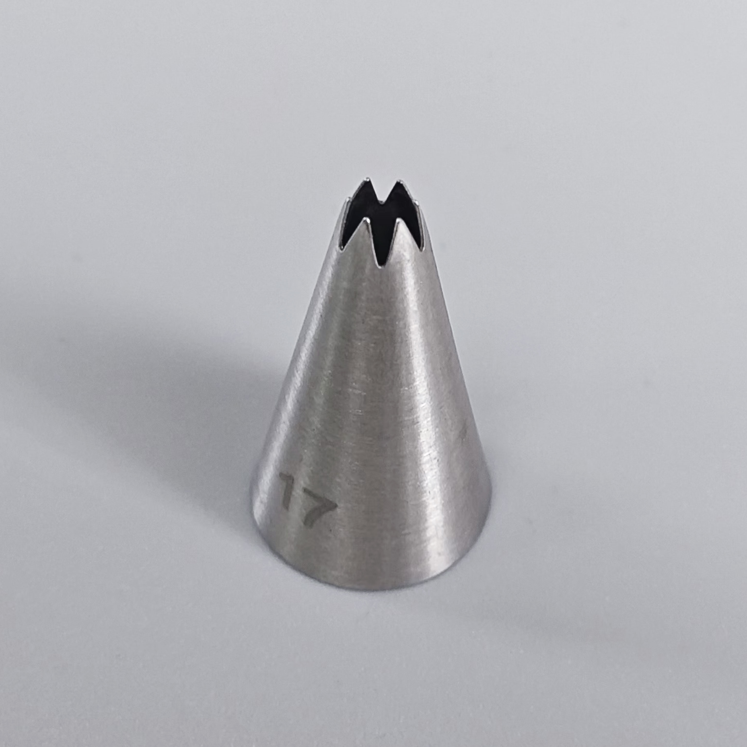 Cake star trezírovací špička č.17 Kvalitní trezírovací špička z nerezové oceli je perfektním nástrojem pro zdobení dortů, cupcakes, sušenek nebo dezertů. Díky preciznímu provedení umožňuje vytvářet jemné detaily, květy, hvězdičky, okraje či další dekorace. Vhodná pro použití s cukrářskými sáčky – bez nutnosti použití adaptérů. Vlastnosti:- Vyrobena z odolné nerezové oceli- Snadno omyvatelná a znovupoužitelná- Vhodná do myčky nádobí- Ideální pro krémy, šlehačku, máslový krém i bílkovou polevu