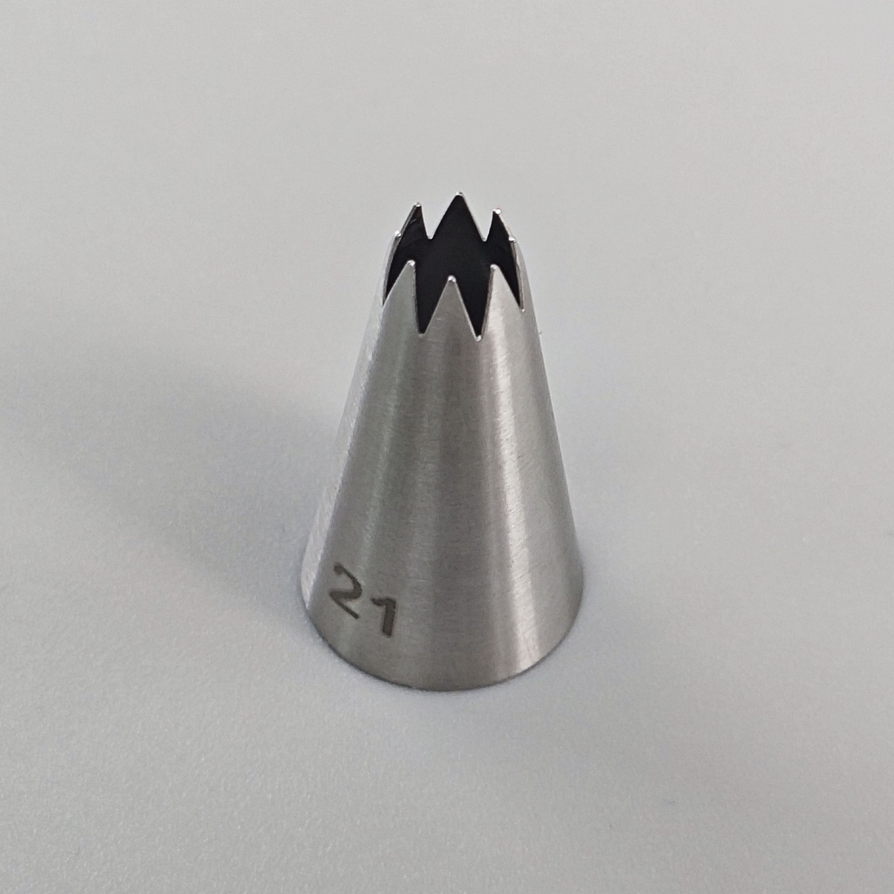 Cake star trezírovací špička č.21 Kvalitní trezírovací špička z nerezové oceli je perfektním nástrojem pro zdobení dortů, cupcakes, sušenek nebo dezertů. Díky preciznímu provedení umožňuje vytvářet jemné detaily, květy, hvězdičky, okraje či další dekorace. Vhodná pro použití s cukrářskými sáčky – bez nutnosti použití adaptérů. Vlastnosti:- Vyrobena z odolné nerezové oceli- Snadno omyvatelná a znovupoužitelná- Vhodná do myčky nádobí- Ideální pro krémy, šlehačku, máslový krém i bílkovou polevu