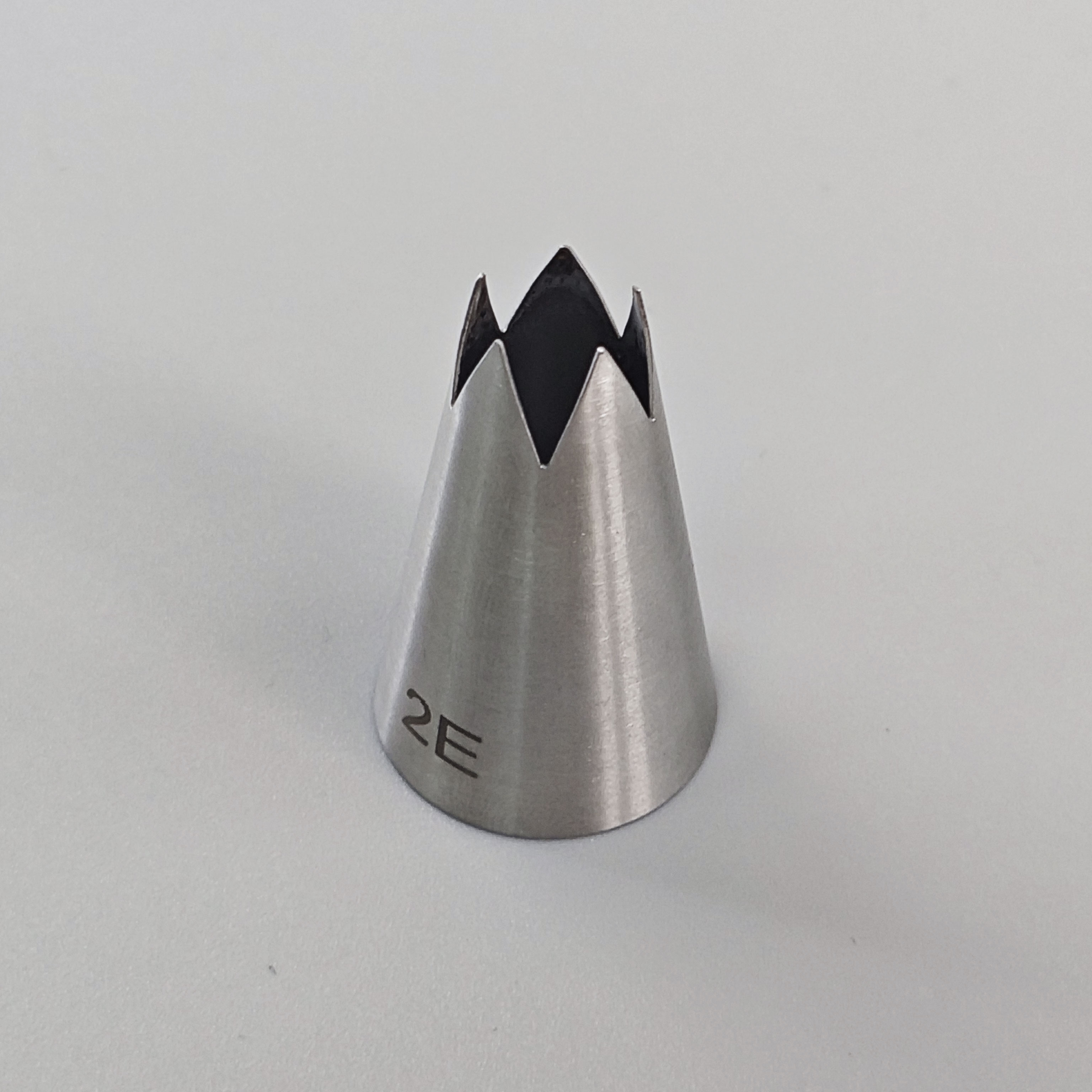 Cake star trezírovací špička č.2E Kvalitní trezírovací špička z nerezové oceli je perfektním nástrojem pro zdobení dortů, cupcakes, sušenek nebo dezertů. Díky preciznímu provedení umožňuje vytvářet jemné detaily, květy, hvězdičky, okraje či další dekorace. Vhodná pro použití s cukrářskými sáčky – bez nutnosti použití adaptérů. Vlastnosti:- Vyrobena z odolné nerezové oceli- Snadno omyvatelná a znovupoužitelná- Vhodná do myčky nádobí- Ideální pro krémy, šlehačku, máslový krém i bílkovou polevu