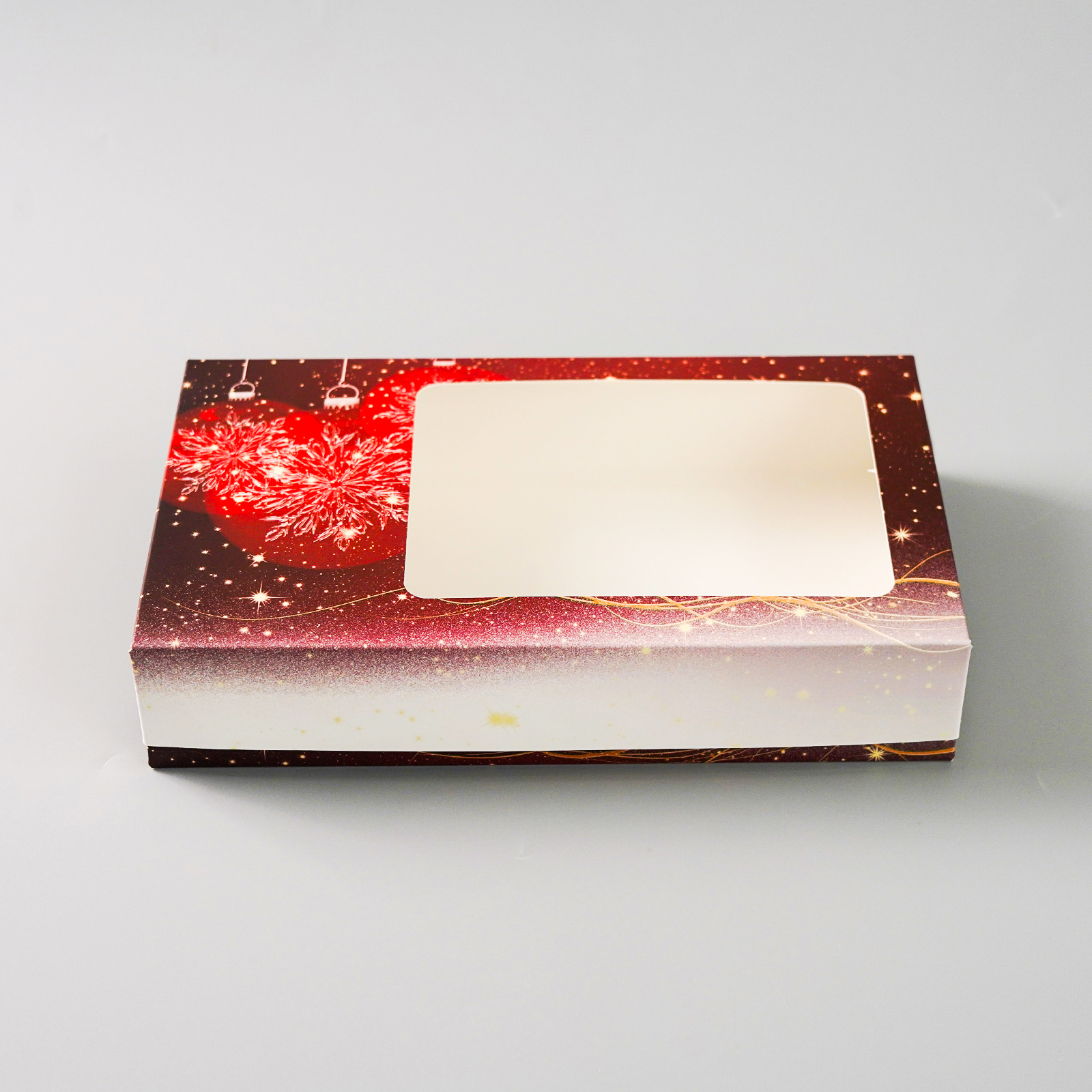 Cake star elegantní dárková krabička s průhledným okénkem v červenobílém svátečním designu. Díky rozměrům 25 × 15 × 5 cm je ideální pro balení cukroví, pralinek, vánočního pečiva, dárkových sad či jiných produktů. Krabička je vyrobena z kvalitního kartonu, s vnitřní laminací. Vnější povrch je potištěn motivem s jemným třpytem, který dodává luxusní dojem a zvýrazňuje obsah. Díky svým rozměrům pojme přibližně 400-600g drobného vánočního cukroví (dle velikosti a tvaru kousků). Klíčové vlastnosti: Rozměry: 25 × 15 × 5 cm Průhledné okénko pro atraktivní prezentaci obsahu