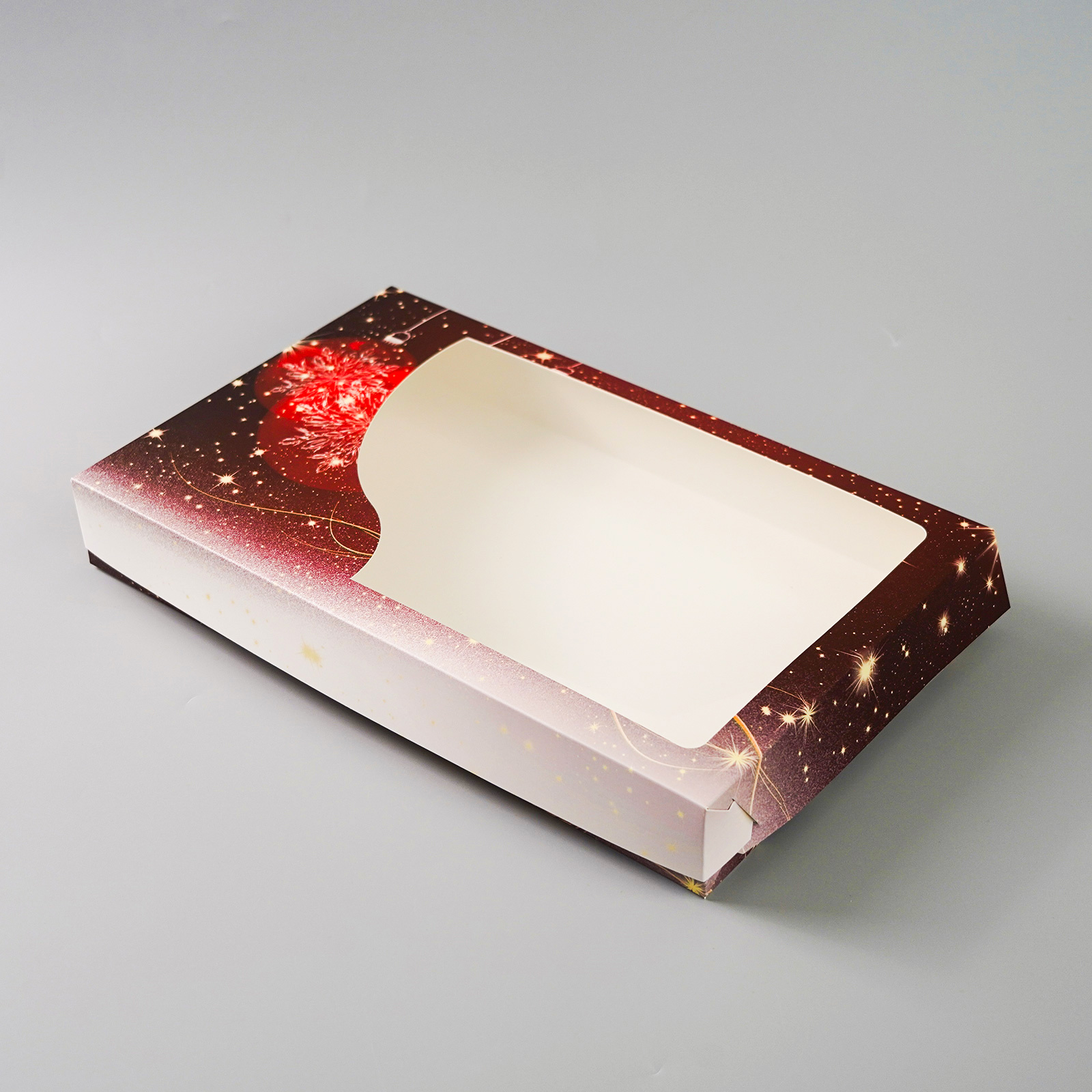 Cake star elegantní dárková krabička s průhledným okénkem v červenobílém svátečním designu. Díky rozměrům 36 × 22 × 5 cm je ideální pro balení cukroví, pralinek, vánočního pečiva, dárkových sad či jiných produktů. Krabička je vyrobena z kvalitního kartonu, s vnitřní laminací. Vnější povrch je potištěn motivem s jemným třpytem, který dodává luxusní dojem a zvýrazňuje obsah. Díky svým rozměrům pojme přibližně 800g–1kg drobného vánočního cukroví (dle velikosti a tvaru kousků). Klíčové vlastnosti: Rozměry: 36 × 22 × 5 cm Průhledné okénko pro atraktivní prezentaci obsahu
