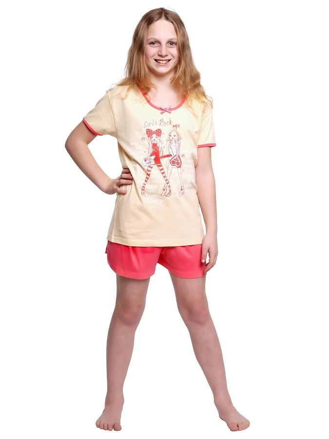 Dívčí krátké pyžamo s potiskem. Kolekce Calvi 2023. materiál 100% Bavlna potisk dívčí kapely a nápisem Girls Rock MP3 kraťasy v oranžové barvě a tričko v barvě žluté u výstřihu mašlička pohodlná vyměnitelná guma