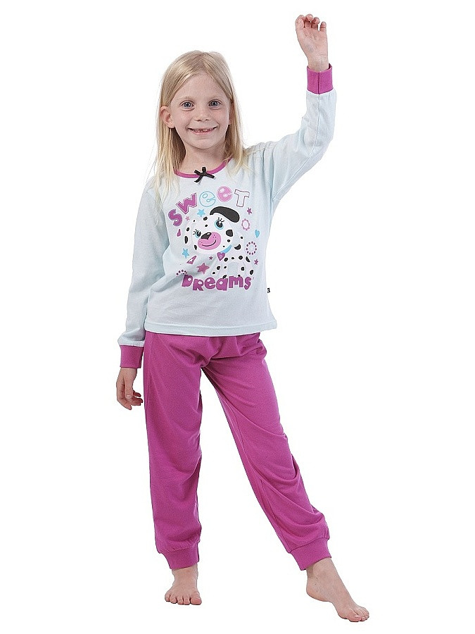 Dívčí pyžamo s dlouhým rukávem. Kolekce Calvi 2023. materiál 100% Bavlna triko s potiskem pejska má kulatý výstřih a dlouhý rukáv rukávy a nohavice jsou zakončeny pružným nápletem pyžamové kalhoty mají v pase vyměnitelnou gumu